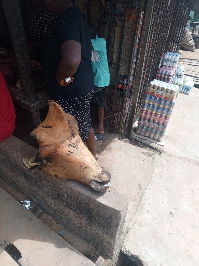 An outdoor scene in Onitsha, Nigeria, depicts a market or street stall setting under bright daylight. In the immediate foreground, a disembodied, light brown animal head, likely a cow or similar large mammal, rests on a raised, grey concrete ledge. The head exhibits visible skin texture, dark scored marks on its cheek, and partially exposed white teeth. Behind the ledge, two individuals are present. One person, positioned closer, wears a dark, possibly ribbed, short-sleeved top and a dark skirt with white polka dots, holding a small white rectangular object behind their back. The second person, partially obscured, wears a light blue/teal garment over their shoulder and dark shorts with light-colored sandals. Both individuals face away from the camera, interacting with a dimly lit stall interior constructed with dark wooden beams. To the right, a metal grid separates the stall area from an outdoor paved section where multiple shrink-wrapped stacks of beverages are stored, including Amstel Malta cans, red-labeled cans, and various water bottles. The ground surface consists of concrete or dirt with minor debris. In the distant background, large woven baskets are visible.