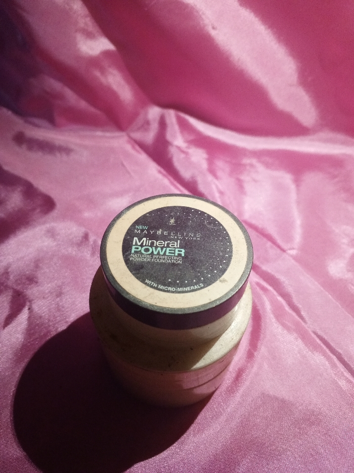 A container of "Maybelline Mineral Power" natural perfecting powder foundation rests on a pink, shimmering fabric