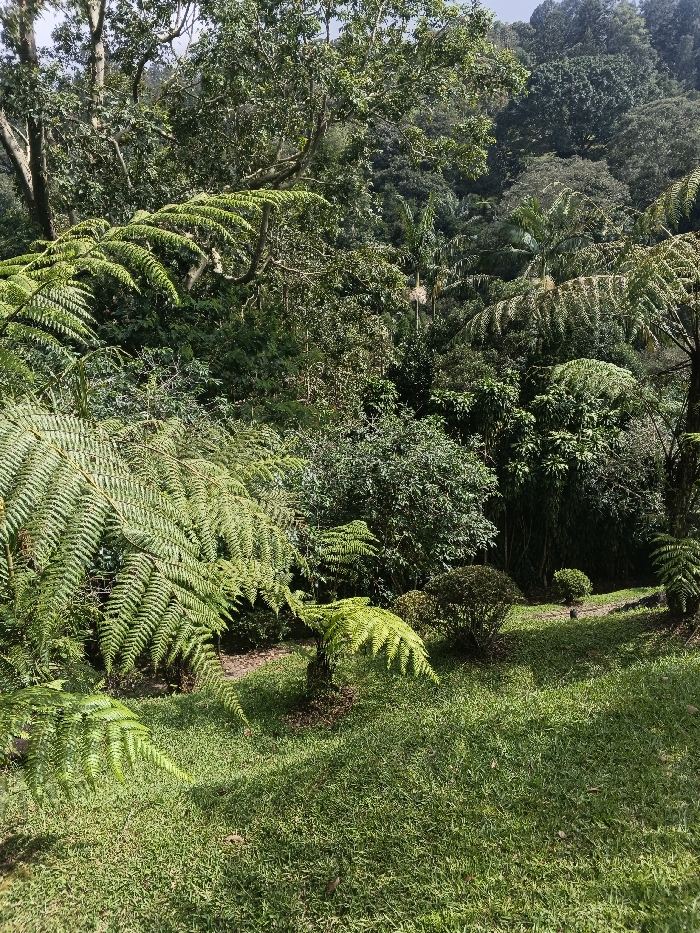 The image depicts a verdant outdoor scene located in Bagochen Boolingpang Ueling, Bhutan, under natural daylight. The foreground features a sloping, manicured lawn of bright green grass. Dominating the left and central midground are large, frond-bearing ferns, characterized by numerous pinnate, light green leaves. Additional smaller, rounded dark green bushes are scattered across the grassy area. The background consists of a dense, multi-layered forest canopy comprising various broadleaf trees and shrubs, presenting a spectrum of green tones. Taller trees are visible toward the upper left and right, with some showing distinct trunks. Several slender, palm-like trees are discernible within the dense foliage of the mid-distance. No human subjects, animals, or artificial structures are present within the frame.