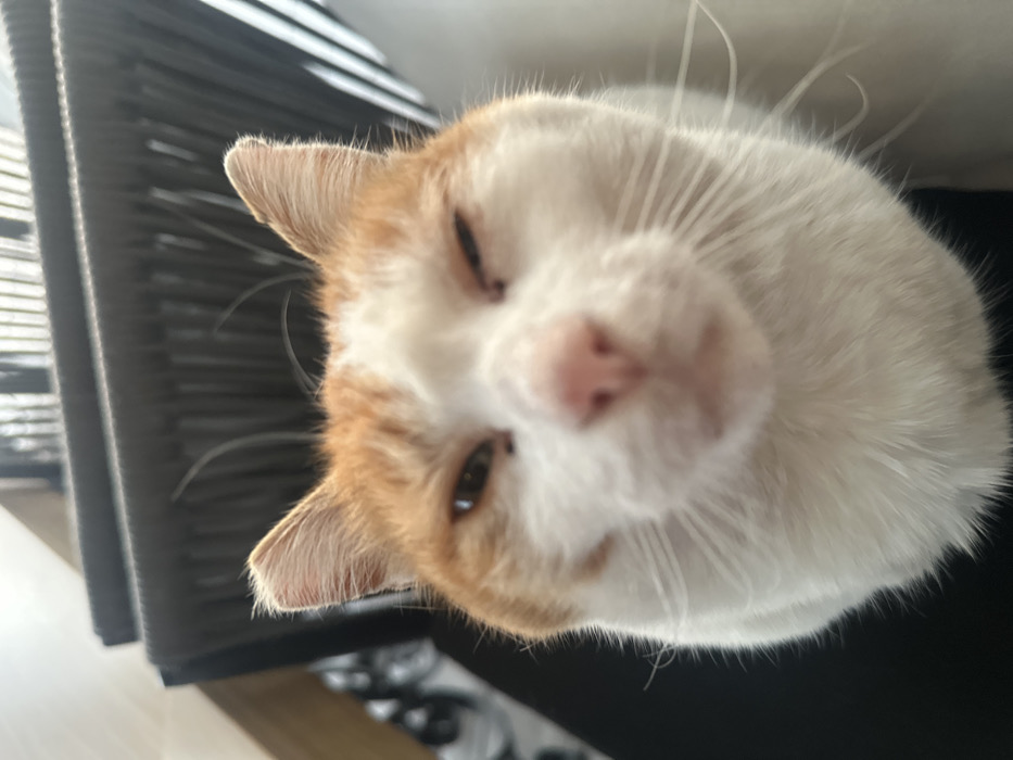 - "The image displays a close-up, low-angle perspective of an orange and white bi-color cat, facing directly towards the camera" by FM-nj7ub2, licensed under CC BY 4.0