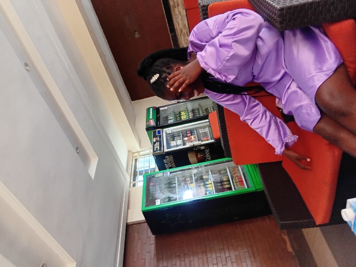 The image depicts an indoor space consistent with a lounge or bar, located in Lokoja, Nigeria. A young woman, appearing to be of African descent, is seated on a dark brown wicker-style sofa with bright orange cushions, positioned towards the right of the frame. She wears a loose-fitting, long-sleeved, lavender-colored garment made of a satin-like material. Her dark hair is pulled back into a high ponytail, adorned with multiple shimmering decorative clips. Her right hand is raised, covering her mouth and nose, while her face exhibits an expression suggesting laughter or a broad smile. Her left hand rests on her left thigh. In the background, three commercial display refrigerators are visible, fully stocked with various bottled and canned beverages. The leftmost refrigerator is green, and the middle one prominently features "GUINNESS" branding. The interior features a red brick accent wall on the left, a darker wall to the rear, and a white ceiling with recessed lighting and decorative rectangular panels. A window with vertical blinds is partially visible behind the refrigerators. A white carton is partially visible in the bottom left foreground.