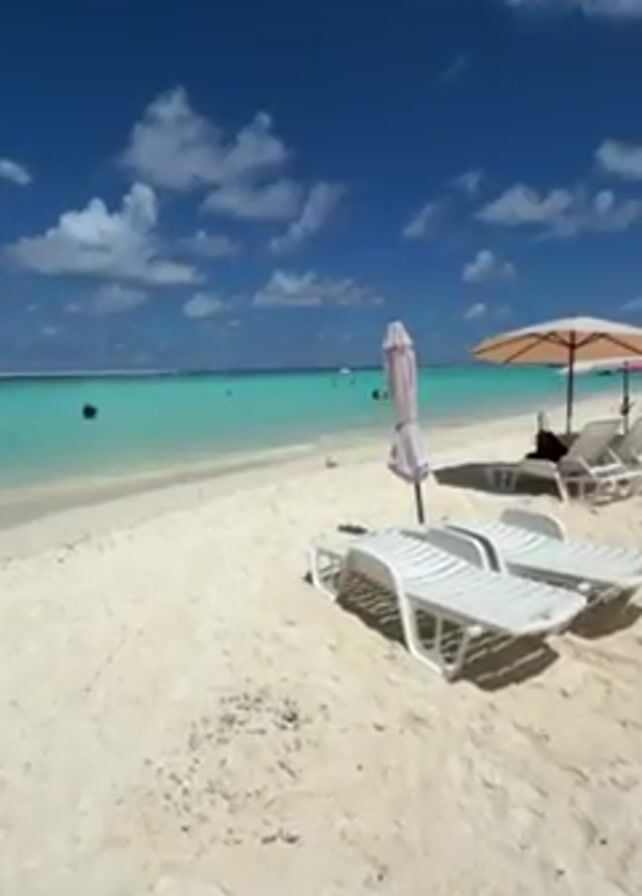 tropical beach on a sunny day. The sand is white and the water is turquoise. There are several people swimming in the water, which is calm. There are white plastic beach chairs and umbrellas set up on the sand. The sky is blue with scattered white clouds.