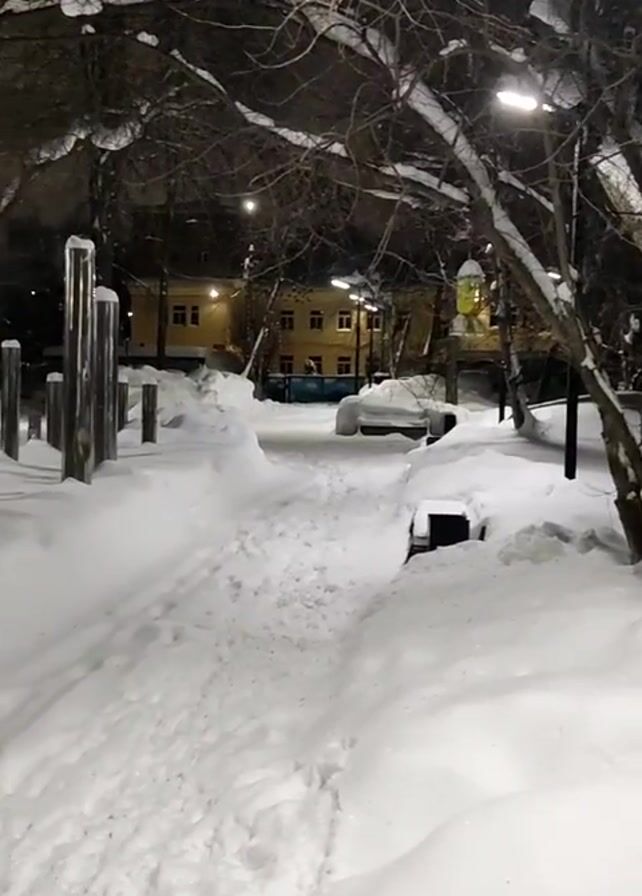 snowy park at night. There is a path cleared through the snow, lined with trees and metal posts. A building is visible in the background, lit by streetlights. No people or animals are visible.