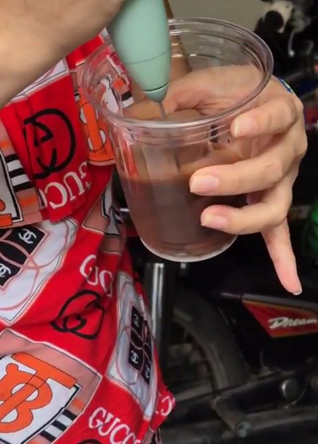 A person in a red patterned shirt is using a small electric frother to mix a dark brown liquid in a clear plastic cup. The frother is light blue-green, and the cup is partially filled. The background includes a motorcycle and a container labeled "LOCK&LOCK."
