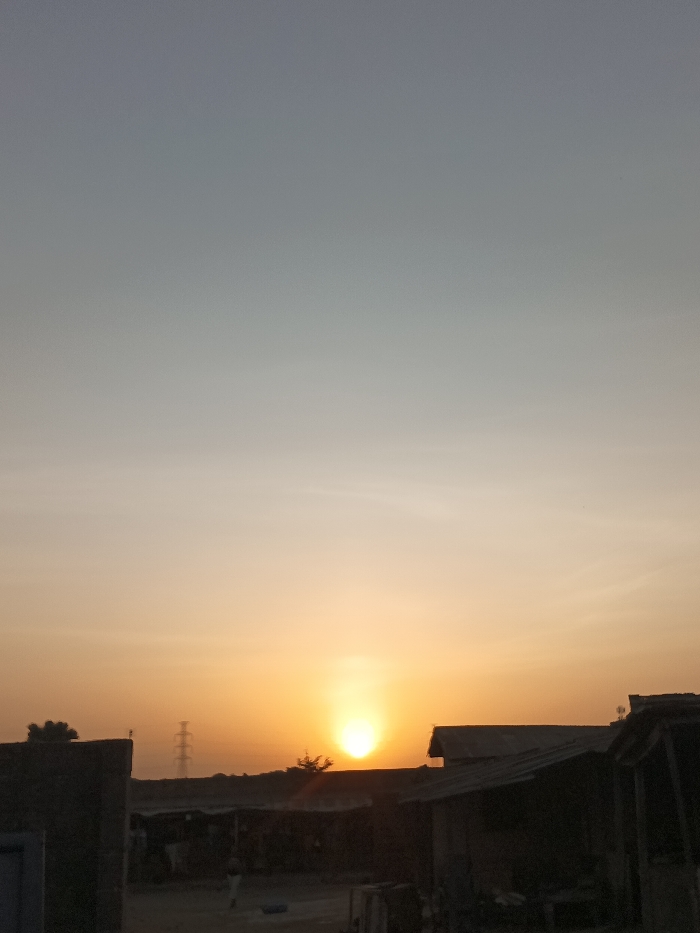 A bright sunset casts an orange glow across a townscape. Silhouetted buildings and a power line are visible against the bright sun. The sky transitions from orange near the horizon to a pale gray-blue above. A lone figure walks along a dirt path in the foreground. The scene captures a moment of serenity within an ordinary setting.