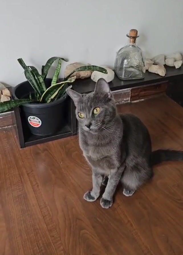 A gray cat sits on a wood floor facing the camera