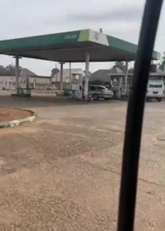 A person in a moving vehicle films a petrol station, branded as "ap," in Bukuru, Nigeria, in daylight