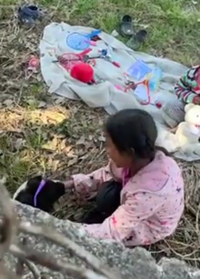 Two young girls sit on the ground beside a blanket with various toys scattered across it. The ground is covered in grass and dry leaves. The girl in the foreground wears a pink pajama top with a star pattern and black pants. She is reaching for a small black and white lamb wearing a purple collar. The second girl sits on the blanket, partially obscured, wearing a striped shirt. A teddy bear sits next to her. In the background, pairs of sandals and shoes are scattered on the blanket. The video is shot from behind a concrete barrier.