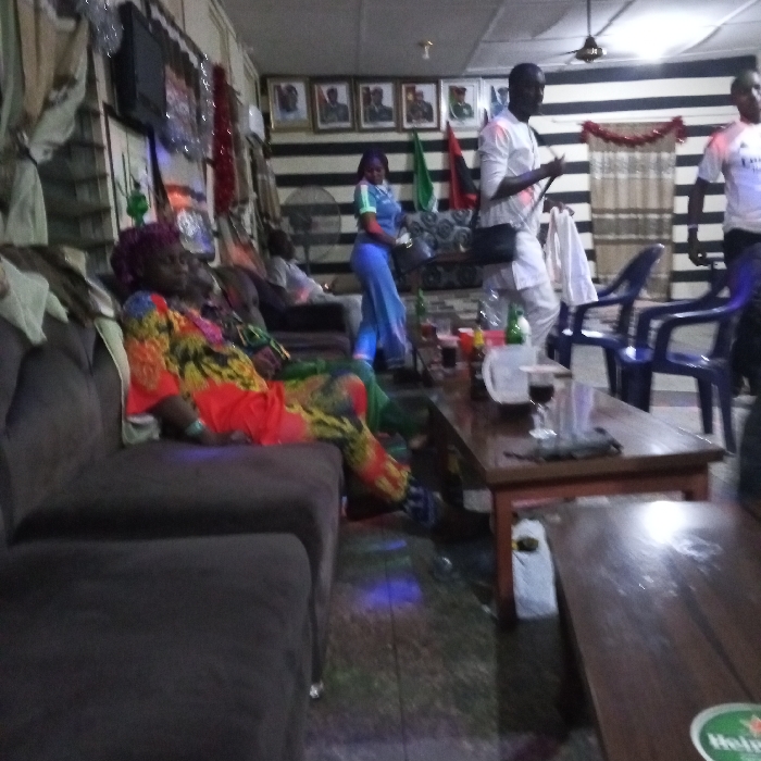 This image depicts an indoor social gathering space in Benin City, Nigeria, characterized by dim lighting