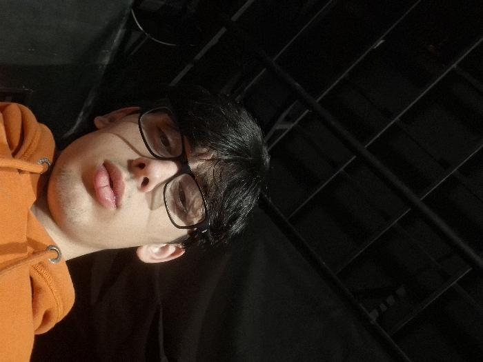 The image captures a young male, likely in his late teens or early twenties, facing the camera from a low-angle perspective