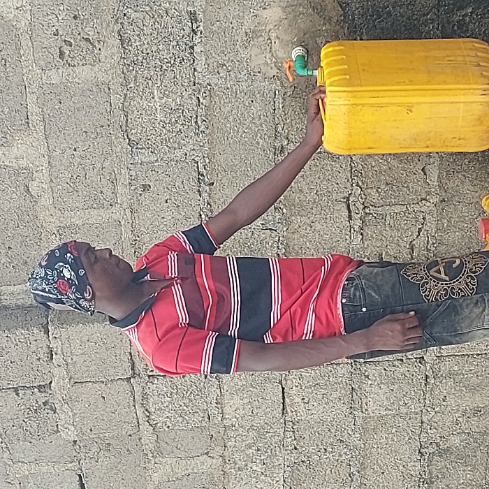 - "In Gudi, Nigeria, an individual stands next to a yellow plastic jerrycan positioned against a light grey concrete block wall" by FM-YzAfB2, licensed under CC BY 4.0