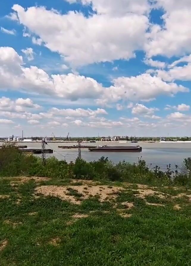 wide river from an elevated viewpoint with green grass in the foreground. The sky is blue with white clouds. There are barges on the river. Industrial structures are on the river's far bank. The camera pans slowly to the right.