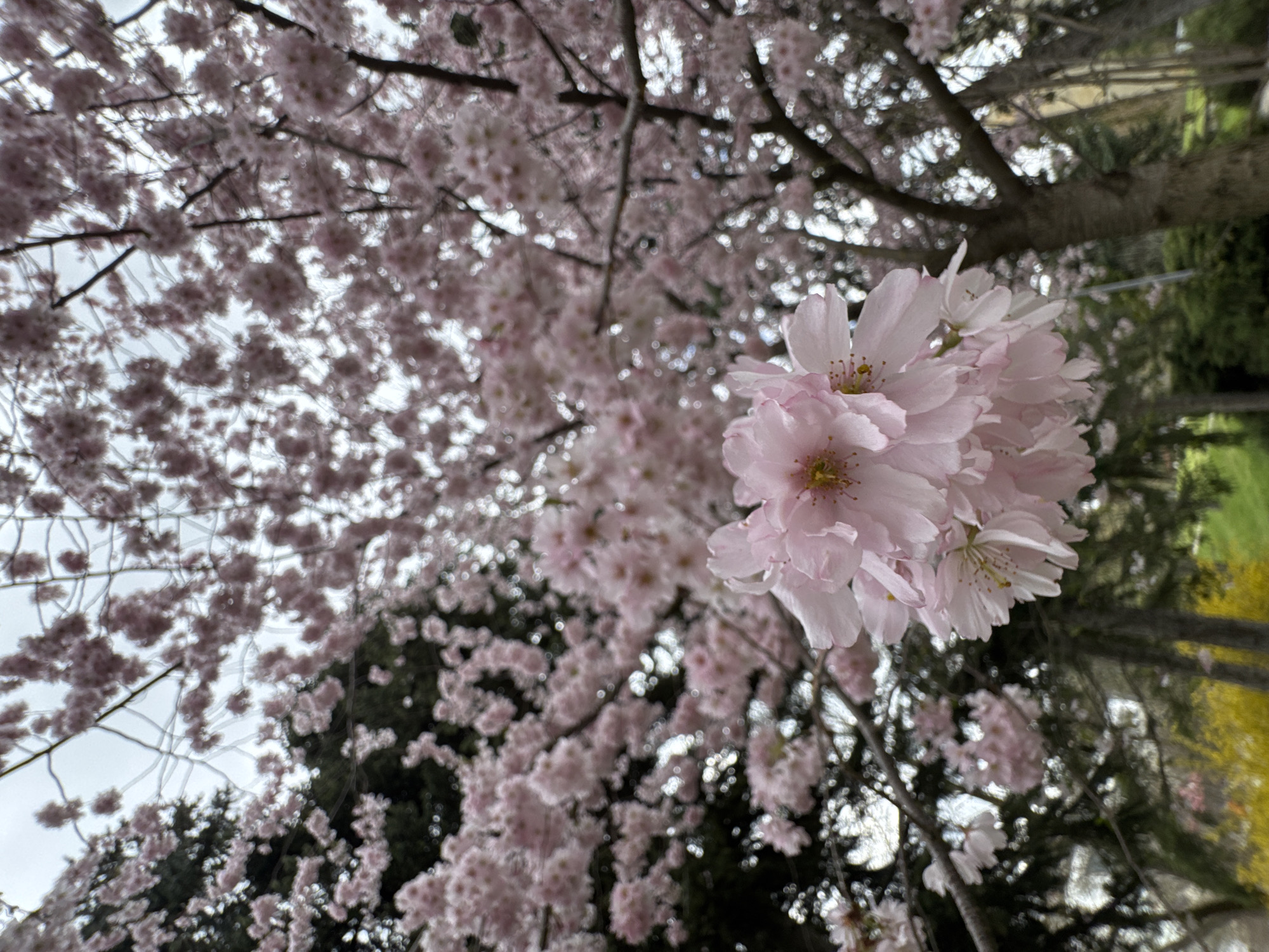 cluster of light pink cherry blossom flowers in focus, likely of the Prunus serrulata variety, against a blurred background of more cherry blossoms, tree branches, and hints of greenery