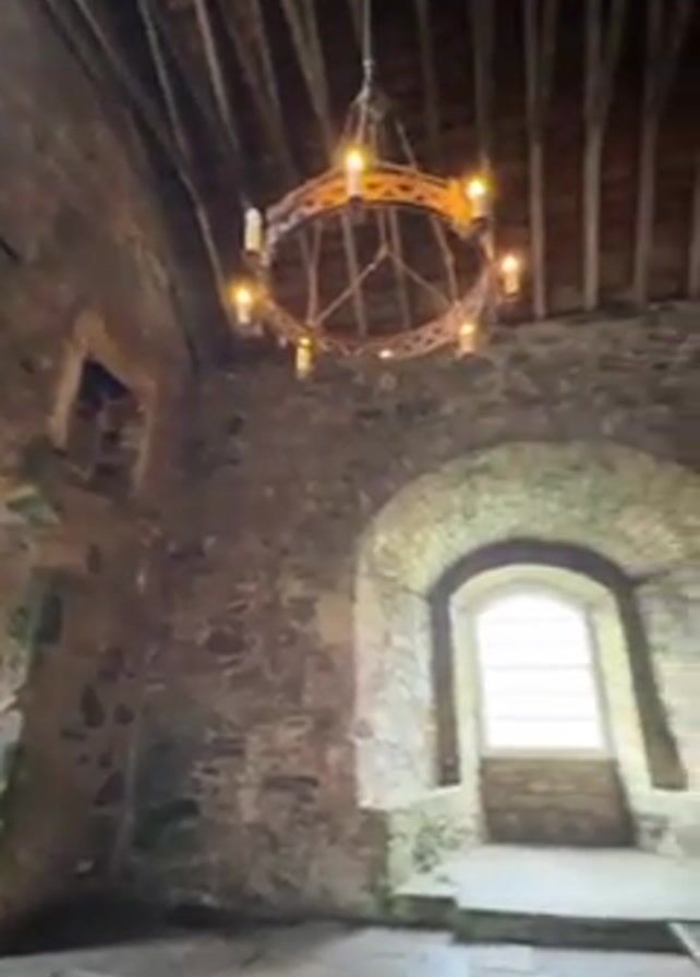 interior of a stone structure, possibly a castle or old building. The room has stone walls with arched windows and a wooden-beamed ceiling. Two decorative, circular chandeliers with what appear to be electric candles hang from the ceiling. A large wooden table sits in the center of the room. The stone floor is gray and appears to be uneven. The lighting is dim, primarily from the windows and chandeliers. The camera slowly pans across the room, showcasing the architectural details and the age of the space.
