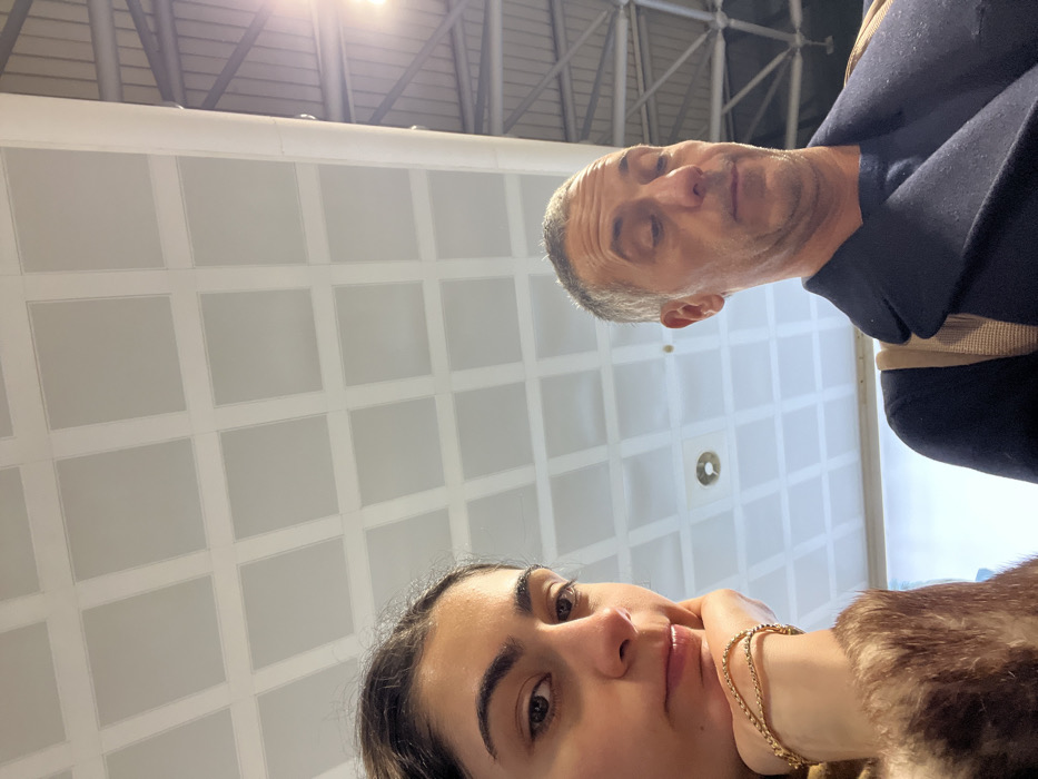 A rotated selfie featuring two individuals. A young woman with dark hair and a gold bracelet rests her chin on her hand. Above her, a mature man with short grey hair appears. The background features a patterned ceiling with square panels and overhead lighting. The image's perspective is angled upward, possibly taken from a low vantage point.