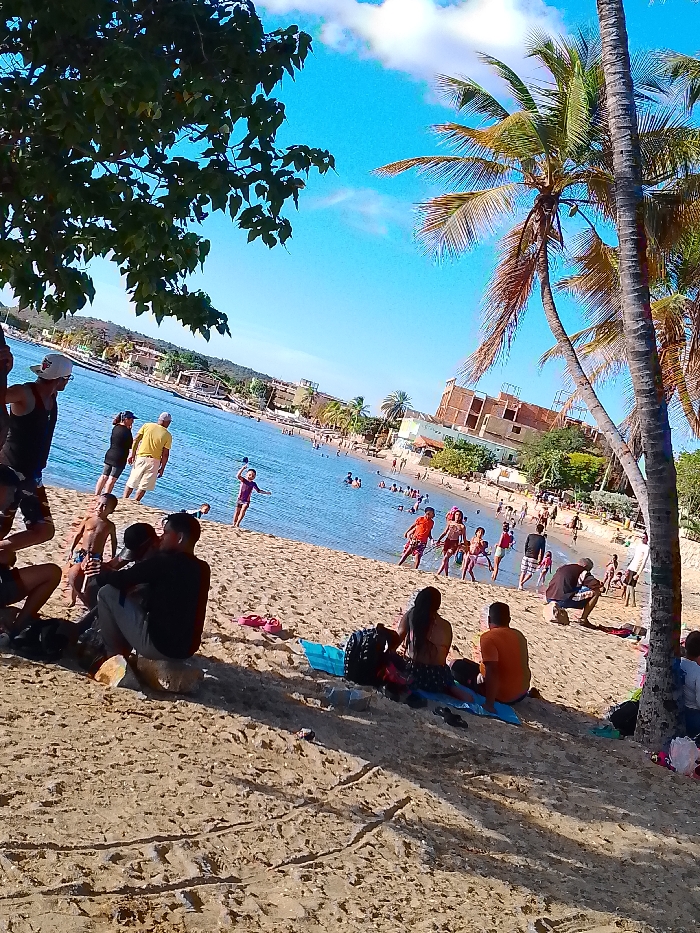 - "The image presents a crowded beach scene in Juan Griego, Venezuela, observed under a clear blue sky with scattered white cumulus clouds" by FM-ymGPj1, licensed under CC BY 4.0