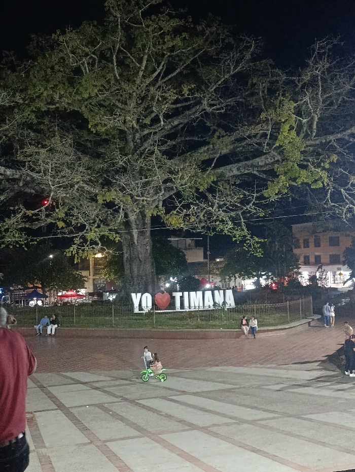 Night view of a town square with a large tree dominating the scene. A sign reading "YO <3 TIMANA" is visible in the background. A few people are sitting or standing around the square. In the foreground, two children ride a small green motorcycle across the paved area. The lighting is dim, and the image has a slightly grainy quality.