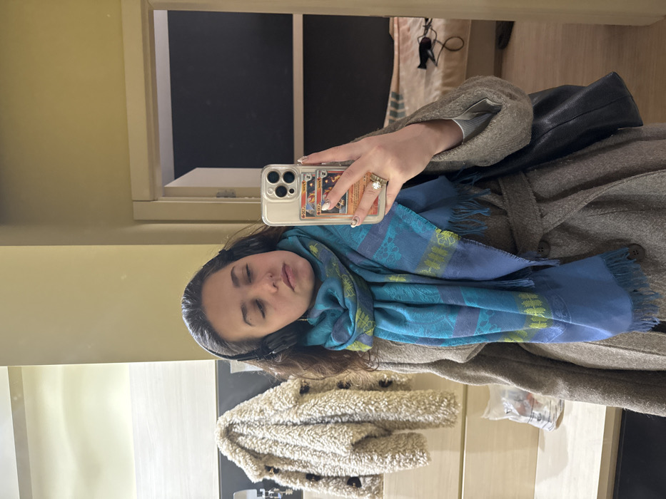 A young adult female is depicted taking a mirror selfie indoors in the city of Sofia, Bulgaria. She wears dark, wavy hair, over-ear headphones, a multi-tonal blue scarf with green accents, and a light brown woolen overcoat. Her eyes are partially closed. She holds a light-colored smartphone in a clear case containing two Pokémon Charizard V trading cards in her right hand. A ring with a prominent stone is visible on her right ring finger. A dark shoulder bag is carried on her left side. The mirrored background to the subject's left shows a light-colored wall or closet section with a cream-colored, textured jacket hanging. To the right, an open doorway reveals a darker room with a portion of a bed displaying patterned bedding and a black hairdryer on the floor.