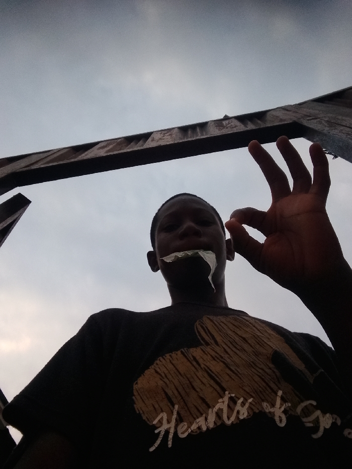A low-angle shot features a person with dark skin, appearing to be outdoors under a cloudy sky with wooden structures framing the top. The person is wearing a dark t-shirt with light-colored text and a design. They have a piece of paper or plastic in their mouth and are making an "OK" sign with their hand. The composition is slightly off-center, drawing attention to the person's face and hand gesture.