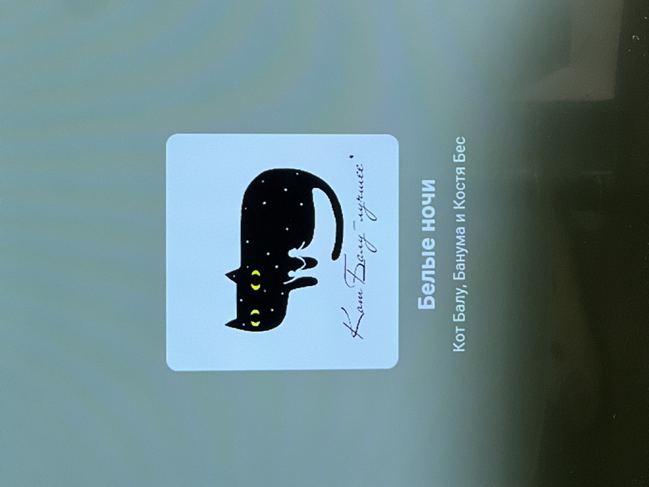 The scene depicts a digital screen displaying an image, observed from the city of Rafailovići, Montenegro. The primary subject is a vertical rectangular digital display with a subtle gradient background, transitioning from a lighter teal-gray at the top to a darker gray-green at the bottom. Centered on this screen is a light blue rounded square graphic featuring a stylized black cat with prominent yellow oval eyes and small white dots scattered across its body. Below the cat, within the blue square, is handwritten-style black text that reads "Кот Балу лучшее" (translating to "Cat Baloo is the best"). Directly beneath this blue graphic, aligned centrally on the screen's background, is the bold white text "Белые ночи" (translating to "White Nights"). Below this, in a smaller white font, is the text "Кот Балу, Банума и Костя Бес" (translating to "Cat Baloo, Banuma and Kostya Bes"). No people, specific actions, or other objects are visible in the immediate environment beyond the screen itself.