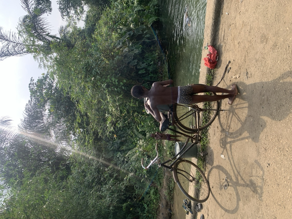 The image depicts an outdoor scene in Ikot Obio Ata, Nigeria, on what appears to be a sunny day, evidenced by strong shadows and sun flares. In the foreground, a young, bare-chested male individual, likely a child, stands barefoot with his back to the camera. He wears patterned boxer briefs and is positioned beside a vintage-style, dark-colored bicycle with a step-through frame, which is propped up on a kickstand. The individual appears to be interacting with an object, possibly a container, placed on the bicycle's rear rack, with his hands positioned over it. To the left of the bicycle, a grey bucket is suspended from the bicycle's frame, near the front wheel. A pair of dark sandals lies on the dirt ground further to the left. The ground consists of light brown packed earth, possibly a path or roadside. In the mid-ground, a body of calm water, resembling a stream or pond, runs parallel to the dirt path. Another smaller individual, also a child, is partially submerged in this water, standing near the left bank, facing towards the foreground individual. This child wears dark briefs. On the bank of the water body, near the foreground individual, a crumpled red plastic bag and a black flexible tube are visible. The background is dominated by dense, lush green vegetation, including tall trees with palm-like fronds and bamboo-like stalks, indicating a tropical or subtropical environment. The sky is bright, with visible sun rays descending from the upper left. The overall scene suggests a routine activity, possibly involving water collection or bathing, in a natural, rural setting.