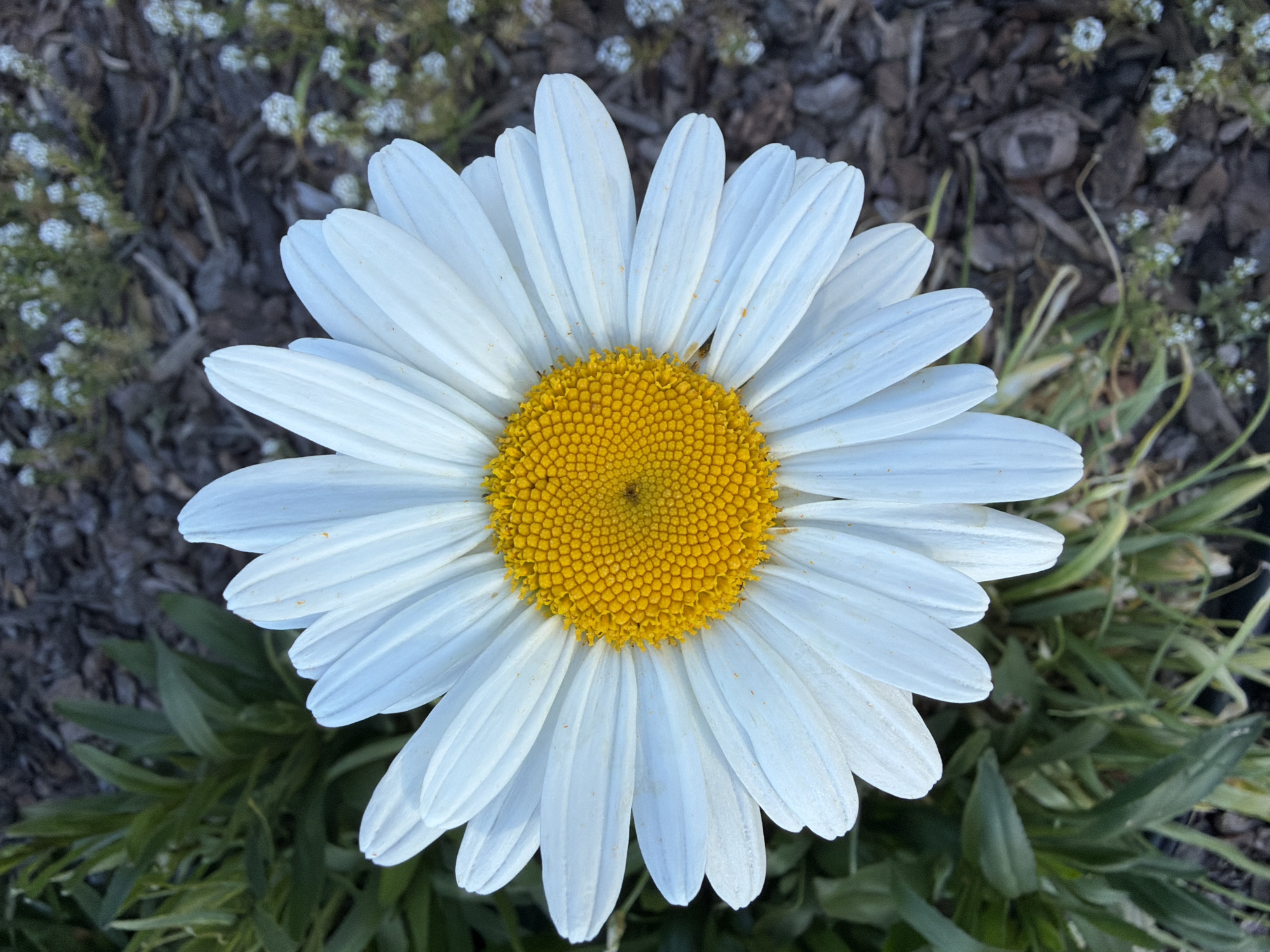 A single white daisy is centrally positioned, dominating the frame. The flower exhibits numerous elongated white ray petals radiating symmetrically from a densely packed, circular yellow disc florets center, which displays a distinct spiraling pattern. To the bottom and left, dark green foliage is visible. To the upper right and top, the background consists of dark brown wood mulch or chipped bark, interspersed with clusters of small white flowers. This outdoor garden scene is located in Rancho Palos Verdes, United States of America. No individuals or discernible actions are present.