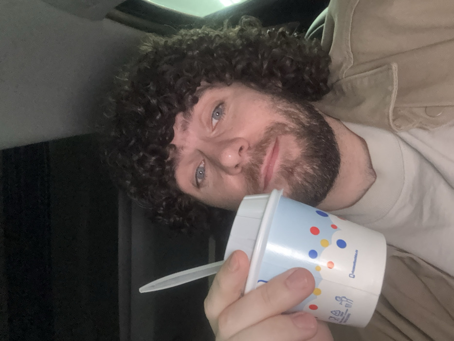 A male individual with dark curly hair, blue eyes, and a beard is depicted in a close-up, selfie-style photograph