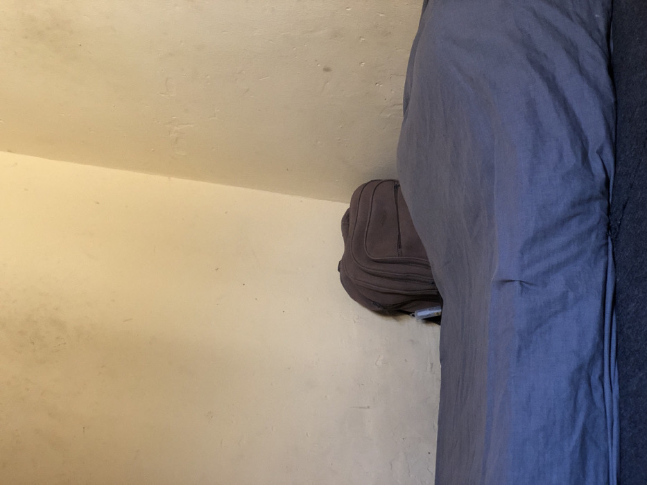 The scene depicts an interior room in Kurudu, Nigeria. A pale yellow wall, exhibiting texture, marks, and minor discoloration, forms the background, meeting another wall at a discernible corner on the right. In the foreground, a bed is covered with a dark blue-gray duvet or comforter, which is slightly rumpled. A dark brown backpack with multiple zippered compartments stands upright against the wall in the corner, positioned behind the bed. A small, light-colored cylindrical object is partially visible to the left of the backpack. No individuals are present in the image.