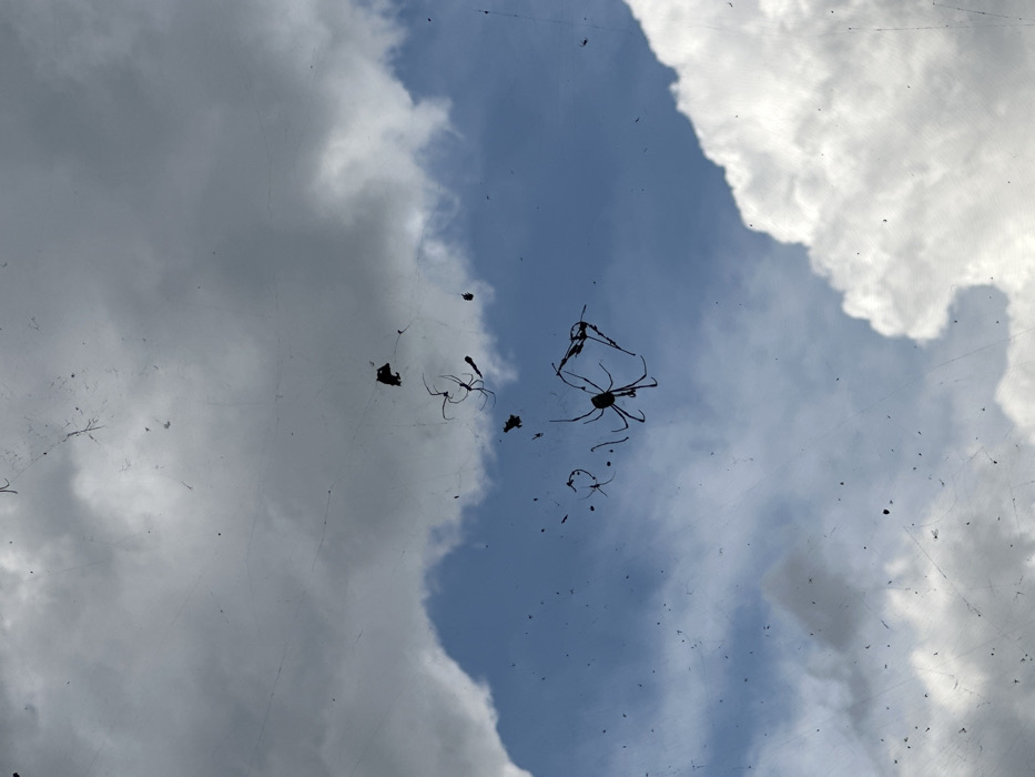 The image depicts an outdoor scene in Kyoto, Japan, captured from an upward perspective against a partly cloudy sky. The upper and lower portions of the frame show substantial white and grey cumulus clouds, with a segment of clear blue sky visible in the mid-section. Multiple dark-silhouetted spiders are suspended within an intricate network of fine spiderwebs that crisscross the entire visual field. A prominent, large spider with a dark body and long, splayed legs is situated slightly below the center-right. To its upper left and right, several other smaller, dark spiders are discernible within the web. A very small, dark insect or arachnid is also visible to the right of the largest spider. Numerous fine, dark lines representing spider silk are visible, along with scattered small, dark specks and amorphous shapes, likely debris or trapped insects, caught within the webbing. The scene is illuminated by natural daylight.