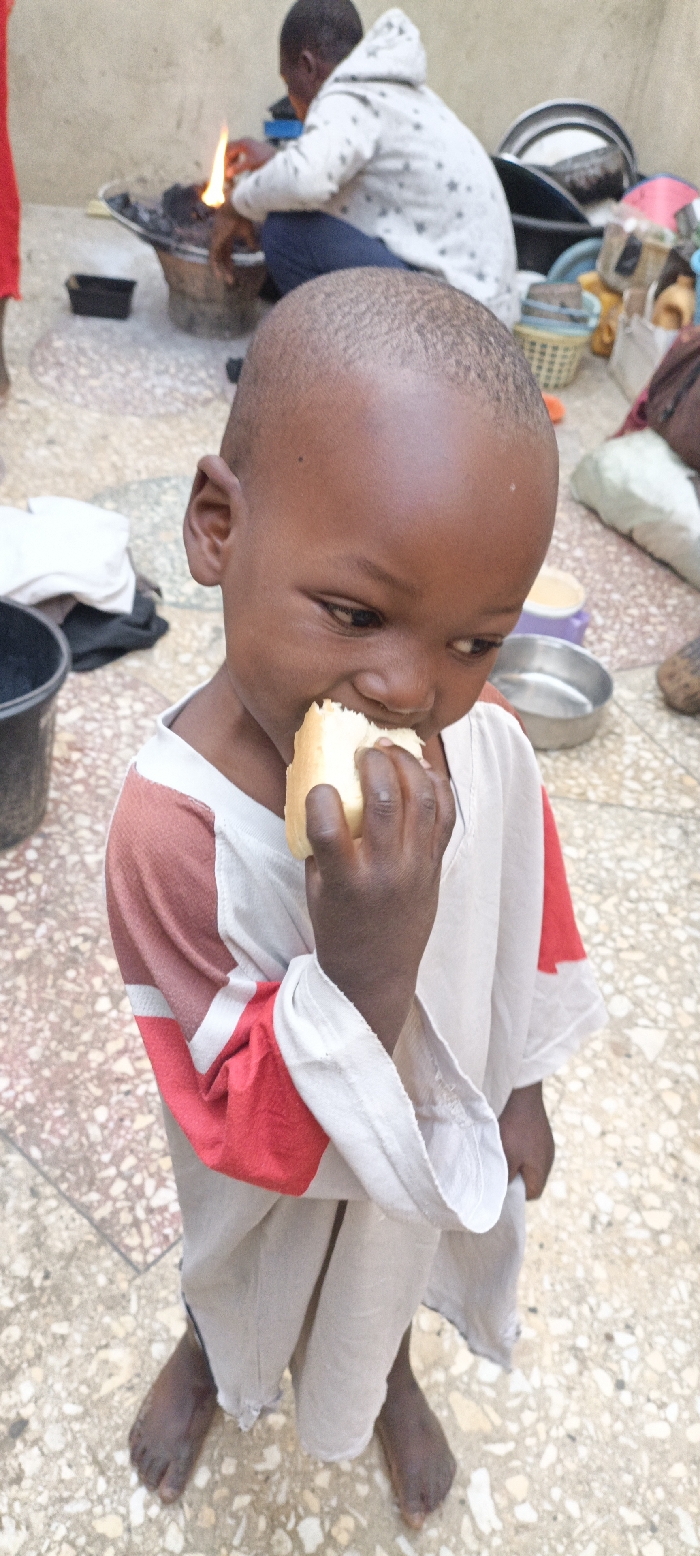 A young, barefoot child eats bread in an outdoor setting. The child wears a loose, long-sleeved shirt with red accents on the sleeves. In the background, an individual tends to a fire in a traditional stove, surrounded by cooking utensils and containers. The scene appears to be a communal area with a basic tiled floor. A black bucket sits to the left, and glimpses of other people and items fill the background.