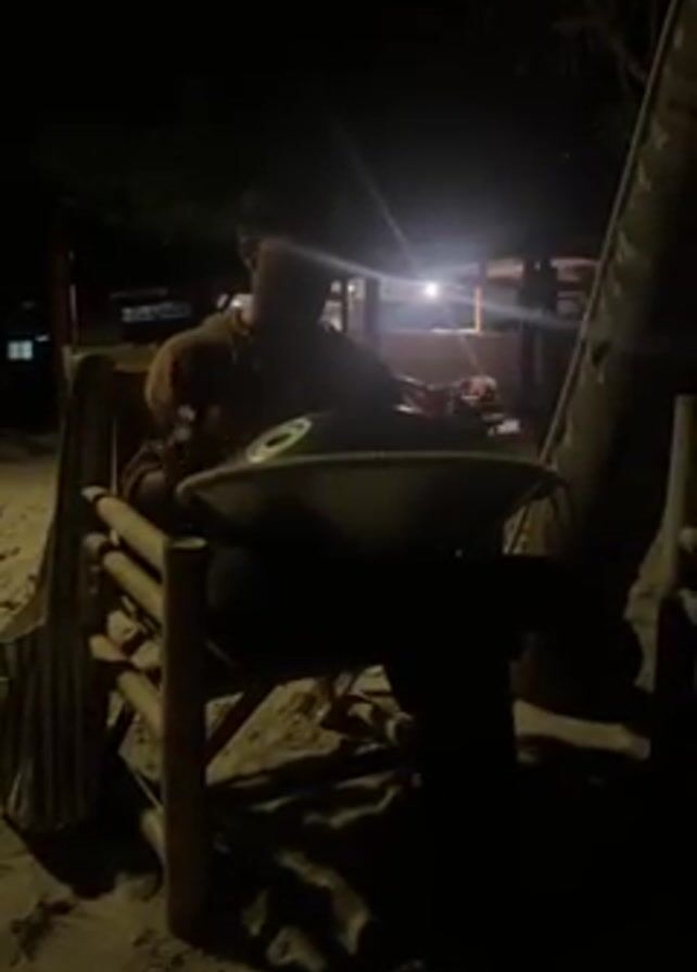 A person is sitting cross-legged in a bamboo chair, illuminated by a bright light in the background. The individual is holding and playing a handpan instrument. The setting appears to be outdoors, possibly on a beach at night, as there's sand visible around the chair, and the presence of a palm tree and other foliage suggests a tropical environment. Some buildings are visible behind the light source. The lighting is stark, with the subject largely silhouetted against the bright background light. The overall scene gives the impression of a musician playing for himself in a tranquil beach setting.