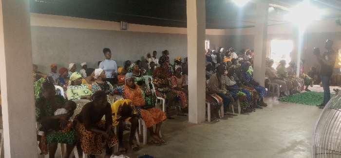 The image captures an indoor gathering within a large, unadorned hall in the city of Unknown, Unknown. Approximately 50 to 70 individuals, predominantly adult females, are seated in rows on white plastic chairs. The room features plain light grey walls, a concrete floor, and visible concrete support pillars. Many of the seated individuals wear headscarves and patterned clothing. In the left foreground, a woman holds an infant. On the far right, a male individual in a dark shirt and blue jeans stands, holding a black electronic device resembling a camera or camcorder, facing the seated audience. A younger female in a light blue top stands in the background, slightly to the left of center. A green mat is laid on the concrete floor near the standing male, and a large metal cage fan is partially visible in the bottom right corner. Bright natural light enters the room from a large opening or doorway located at the rear.