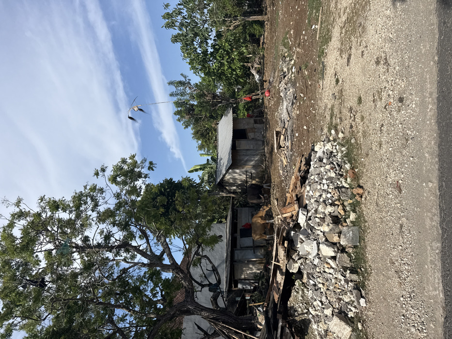 The image depicts a rural or semi-rural scene in Ungasan, Indonesia, under a clear blue sky with scattered white clouds. In the foreground, a paved surface transitions to a gravel and dirt area. Immediately behind this, a large pile of construction debris, consisting of broken concrete, rocks, and wooden planks, dominates the left-center. In the midground, two rustic, single-story structures with corrugated metal roofs are present. The left structure appears to be an open-sided lean-to, partially obscured by a large, mature tree with dense green foliage. Behind this tree, a larger, dilapidated white building is partially visible. The right structure is a small wooden shed with vertical slats. Two cows are observed near these structures: one light brown cow with its head lowered, and a darker-colored cow partially visible behind it, also with its head lowered, seemingly feeding. The ground in this area is uneven dirt, with some scattered debris and a cleared patch of dark earth, possibly a burn pit, to the right of the sheds. A red object, possibly a bucket, is visible near the right shed. The background consists of dense tropical vegetation, including various trees and what appear to be banana plants. High in the sky, a large kite resembling a bird of prey (dark wings, lighter body) is airborne, connected by a string extending downwards out of frame. No human subjects are visible.