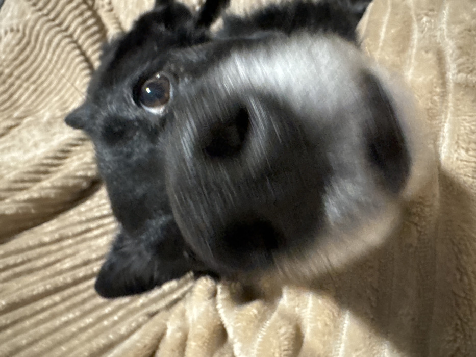 A black rabbit with white nose is the main subject, viewed up close. Only one eye is visible. The rabbit is nestled in a plush tan blanket. The focus of the camera is on the rabbit's nose, giving a blurry effect. The image highlights the rabbit's features in a close-up, endearing perspective.
