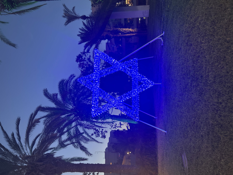 - "large, illuminated, blue Star of David, a six-pointed star, constructed of lights, standing on a grassy field" by FM-HpQn12, licensed under CC BY 4.0