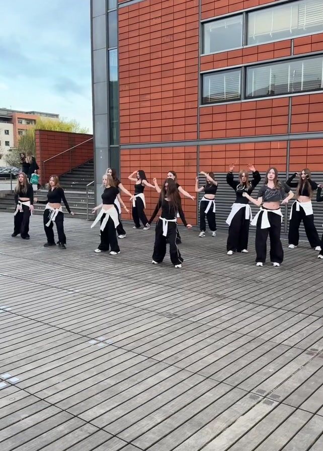A group of about a dozen young women are performing a dance routine outdoors on a wooden platform in front of a large, modern building with red brick and large windows. All the women are wearing similar outfits consisting of black tops and pants with white fabric tied around their waists. They are moving in sync, executing choreographed steps and arm movements. In the background, there are stairs, some people sitting, and a glimpse of other buildings in the distance. The sky is overcast. The overall scene is a dance performance taking place in an urban setting.