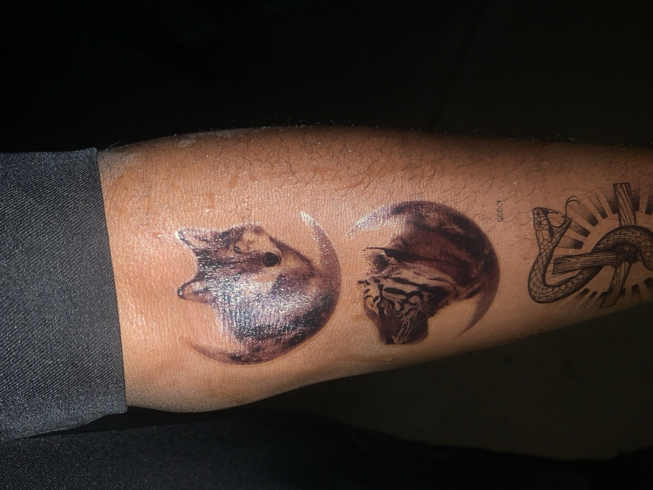 An arm displays three temporary tattoos. From left to right, a dog's head is inside a crescent moon shape, followed by a tiger's head similarly within a crescent. The final tattoo shows a snake coiled around a wooden cross, with rays emanating from behind the cross. The tattoos appear to be slightly glossy.