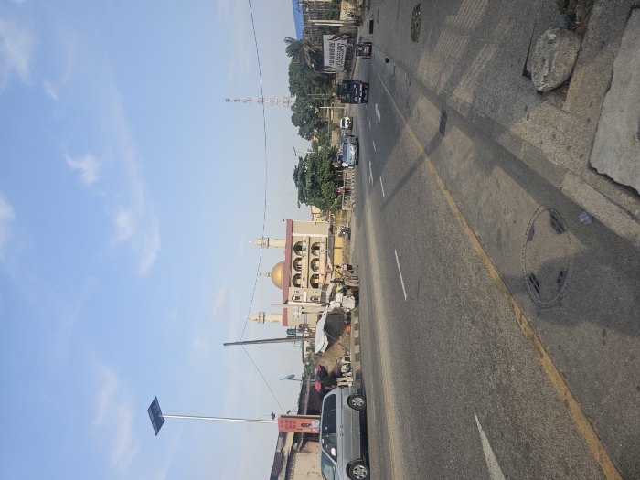 The image presents a daytime urban street scene in Iganmu, Nigeria, under a mostly clear blue sky. A multi-lane asphalt road, marked with a solid yellow line on the right shoulder and dashed white lane markers, dominates the foreground and mid-ground. Vehicle shadows are cast across the road and the concrete sidewalk on the right, which contains a circular metal manhole cover and a large, irregularly shaped rock. On the left side of the road, a silver minivan is parked. Immediately behind it stands a tall metal pole equipped with a solar panel at its apex and a red and white political campaign poster featuring a male figure. Further along the left, several makeshift market stalls constructed with tarpaulins and other materials are visible. Multiple individuals are present in this area, standing near the stalls and the parked vehicle, engaged in what appears to be commercial or social interaction. In the mid-ground, a two-story mosque with a prominent golden dome and two slender minarets is a central architectural feature. The mosque's facade exhibits multiple arched windows or balconies. Surrounding the mosque and extending into the background are various other buildings and scattered trees with green foliage. To the right in the background, a tall, lattice-structured communication tower is visible. Multiple vehicles are observed on the road, including a silver sedan, a dark sedan, a dark utility van, and a three-wheeled vehicle. Several pedestrians are also present on both sides of the road.