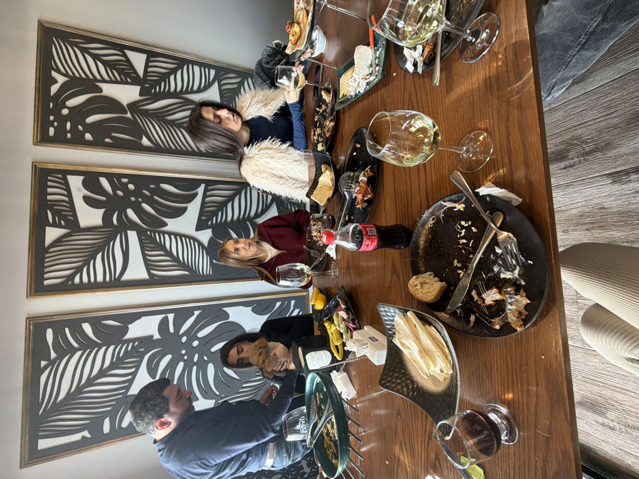 The image depicts an indoor dining scene at a restaurant or cafe in Tsamakaberd, Armenia. A group of individuals is gathered around a large, dark brown wooden table, which is set with numerous dishes and beverages. Five individuals are visible to varying degrees: A male individual with dark hair and a beard, wearing a dark blue long-sleeved shirt and jeans, stands on the left side of the table, leaning slightly forward. To his right, a female with long dark hair, wearing a black top, is seated and holding a small, light-brown fluffy dog in her arms, looking towards the man. Adjacent to her, a second female with lighter, long hair, wearing a dark red long-sleeved top, is seated and looking towards the right side of the frame. Further to the right, a third female with long dark hair, wearing a dark blue top and a light, shaggy, faux fur-like jacket, is seated and looking down towards her plate. Partially visible in the bottom-left corner are the legs of a person wearing light-colored corduroy pants, and in the bottom-right, the legs of another person in dark pants. The table is densely covered with various items, indicating a meal has recently concluded or is ongoing. Numerous dark-colored plates contain remnants of food, including bones, crumbs, and sauces. Specific items include a plate with a slice of bread, a fork, and a knife; several small black dishes holding items such as pickled yellow peppers, red onions, cheese, and possibly nuts. A large green metal serving rack with food remnants is also on the table, as is a plate with several pieces of flatbread. Beverages include multiple clear wine glasses, most containing white wine, some partially consumed, and one glass with a dark red beverage. A plastic bottle of Coca-Cola stands upright. A white tissue dispenser is positioned near the center of the table. The background features a light grey wall adorned with three tall, rectangular panels, each framed in gold. These panels feature dark grey or black cut-out designs of stylized tropical leaves against a white background. The floor is a light-colored wood or laminate with visible grain. Natural light illuminates the scene from an unseen source.