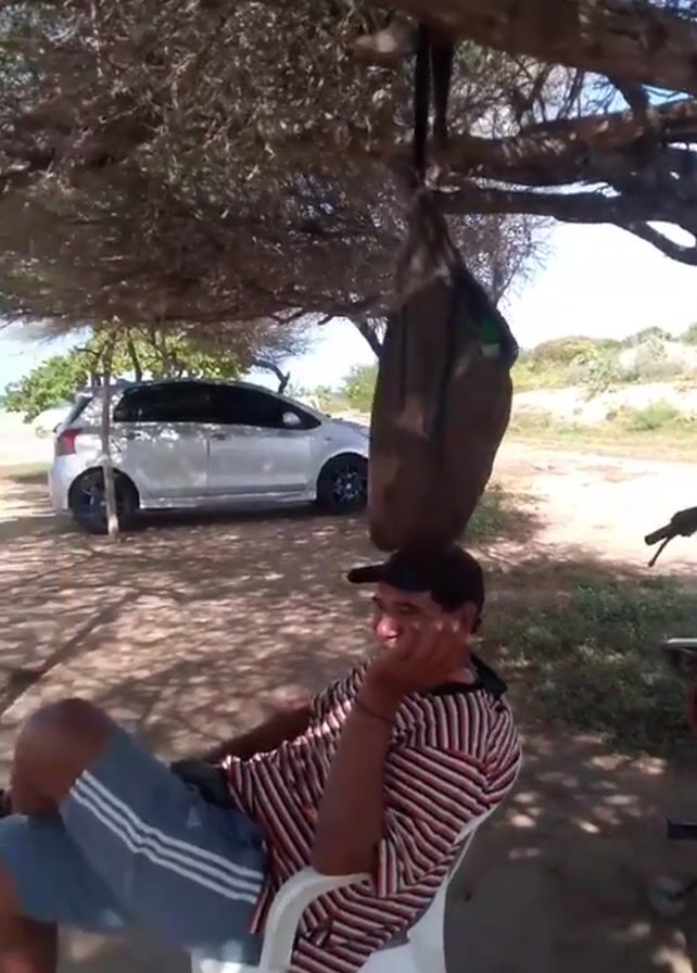 - "A man sits on a white plastic chair under a tree, with a bag hanging above him" by FM-smD6y2, licensed under CC BY 4.0