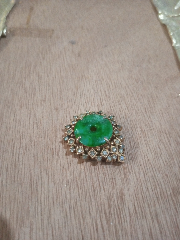 An ornate piece of jewelry is positioned in the lower-right quadrant of a light brown wooden surface. The object features a central, circular, translucent green stone, approximately 1.5 cm in diameter, with a small central perforation. This green stone is secured by four prongs within a gold-toned metal setting. Surrounding the central stone are numerous smaller, clear, faceted stones, each set in a square-shaped bezel, forming an asymmetrical, embellished border around the main stone. The wooden surface exhibits distinct vertical grain patterns and minor surface imperfections. The location of the scene is Chandragiri, Nepal.