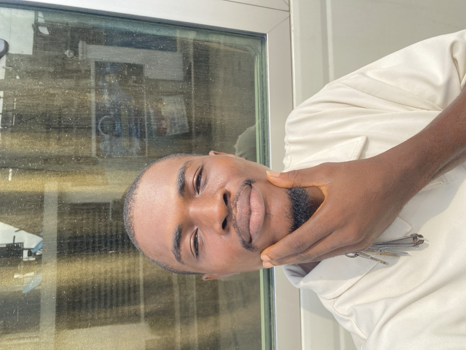 The image captures a young adult male in a close-up, chest-up shot within the city of Langbasa, Nigeria