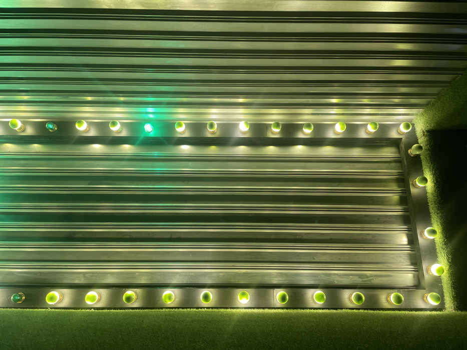 An abstract scene features a series of horizontal parallel lines against a backdrop of illuminated green lights. The green lights line the top, bottom, and right side of the image, with each light emitting a bright, soft glow. Artificial green turf borders the lower edge and the right side of the image. The composition creates a mesmerizing interplay of light, shadow, and textures.