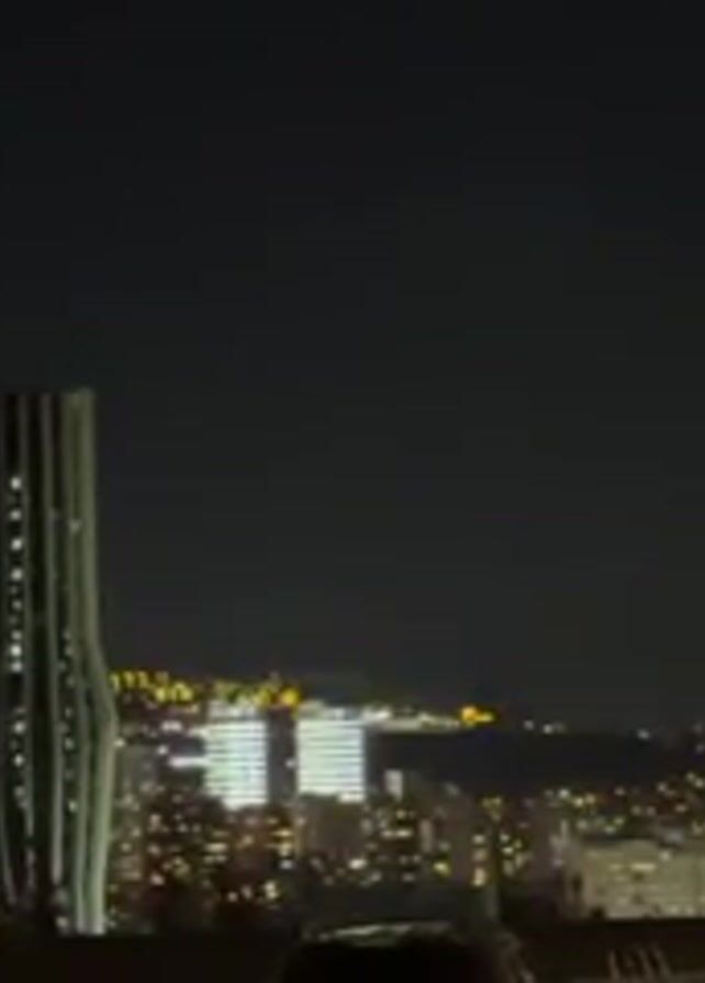 cityscape at night. There are several tall buildings lit up in the distance. Two buildings in particular are very tall and have a unique, wavy design. The sky is dark and clear. There are some other buildings and lights visible on a hillside in the background. Some indistinct voices can be heard speaking in the background.