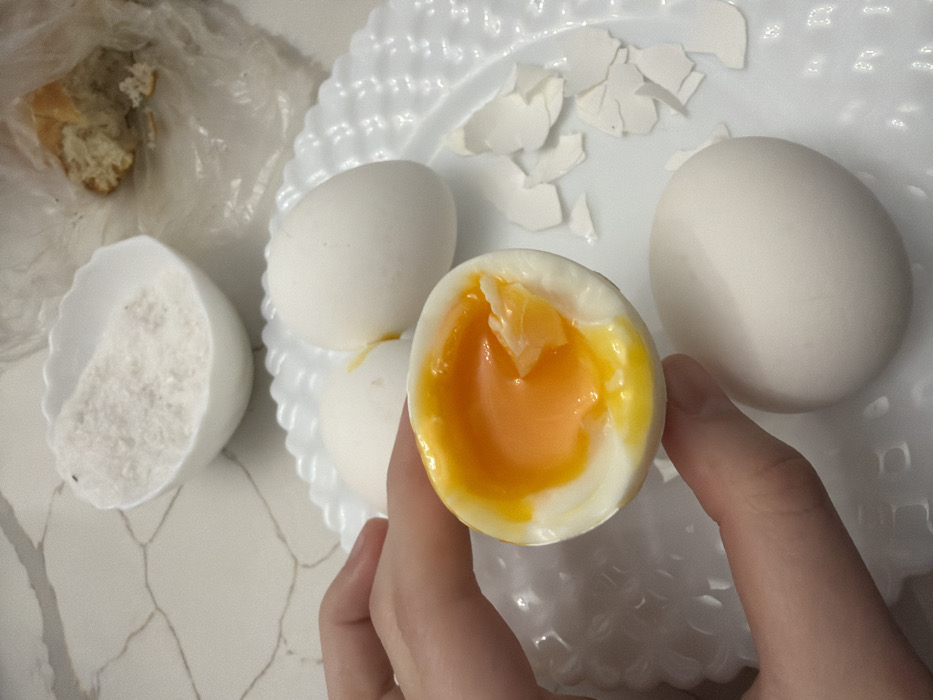 A partially eaten soft-boiled egg is held in a hand, revealing a bright orange, runny yolk