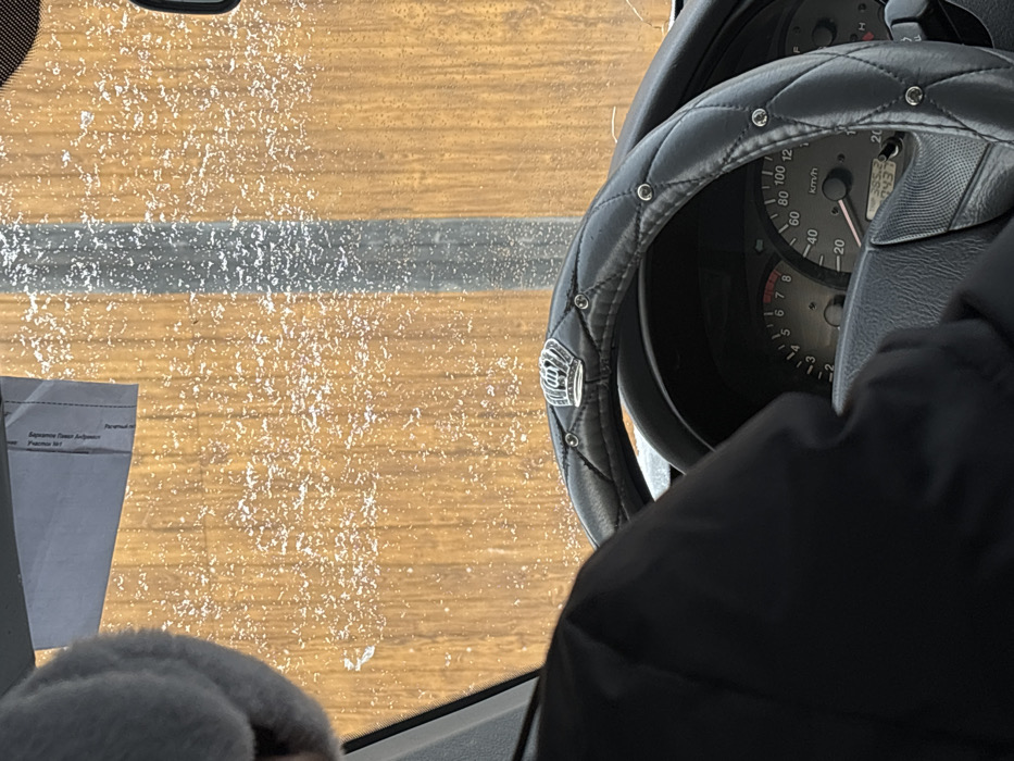 The image captures an interior view from a stationary vehicle in Severouralsk, Russia, looking forward through a snow-speckled windshield
