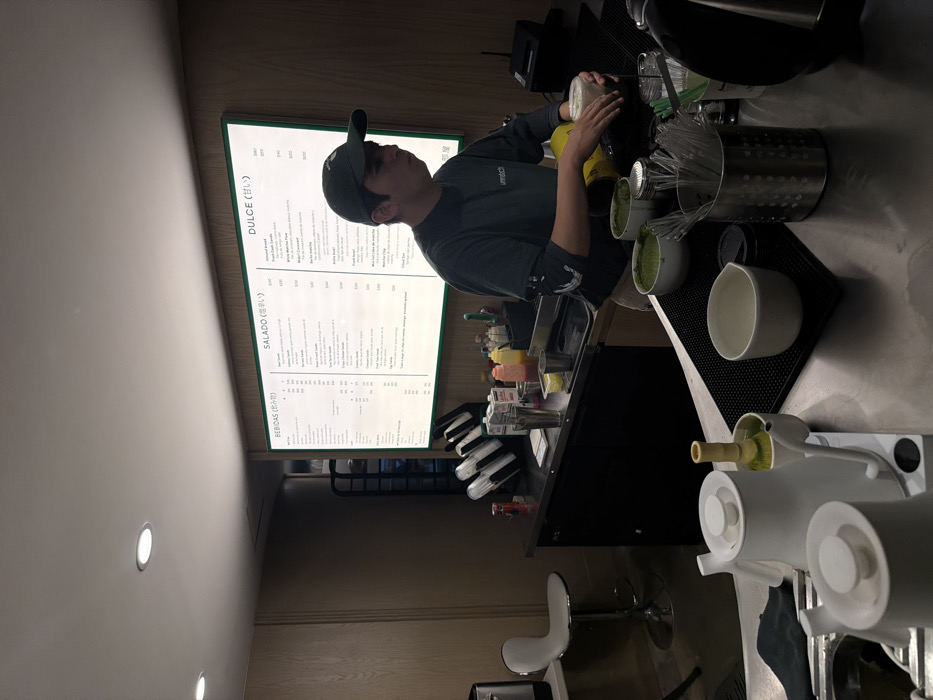 A person in a baseball cap and long-sleeved shirt works behind a counter. A menu board hangs on the wall behind them listing beverage and food items. They appear to be making a beverage, possibly matcha, with various ingredients and utensils around them. A bar stool sits near the counter, and what looks like a machine for frothing milk is on the far right.