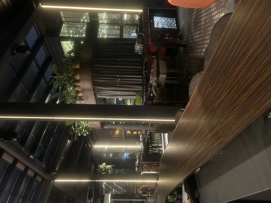 An interior view of the KITCHEN. restaurant in Varna, Bulgaria, depicts a modern, unoccupied dining and bar area at night. A long, dark wood-grain bar counter extends diagonally from the lower-left, terminating near a multi-level bar station in the mid-right. This station features a dark counter, a built-in sink, a small beverage cooler with an illuminated honeycomb pattern, and assorted bottles and glassware. An orange-upholstered chair is positioned adjacent to this bar. In the background, a dining section is visible, containing multiple dark tables and chairs with white place settings. The space is enclosed by large glass windows, through which blurred outdoor lights and reflections are apparent. The ceiling features exposed dark structural beams and a glass or translucent roof section, with spotlights mounted on the beams. Prominent vertical LED strip lights illuminate dark support pillars throughout the space. Decorative elements include numerous potted plants arranged on an elevated, circular wooden planter structure and hanging from the ceiling. A dark curtain below the circular planter displays partially visible white text, identifying the establishment as "KITCHEN." The flooring in the bar area exhibits a pattern of light circular dots on a dark background. No individuals are present, and no actions or interactions are depicted.