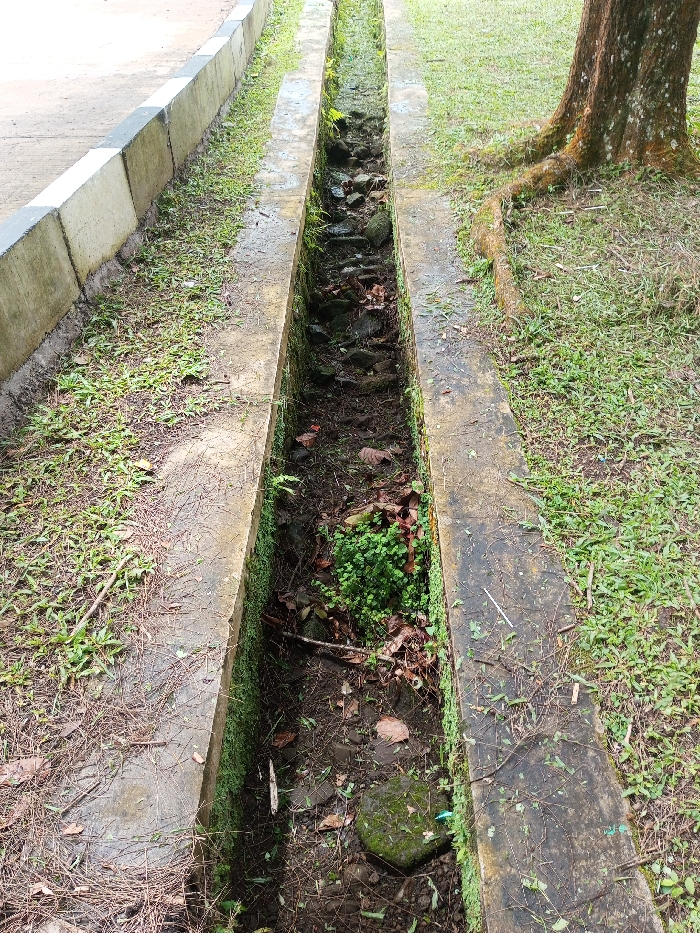 - "A long, narrow concrete drainage ditch filled with debris runs between a paved walkway and a grassy area" by FM-yGnBK2, licensed under CC BY 4.0