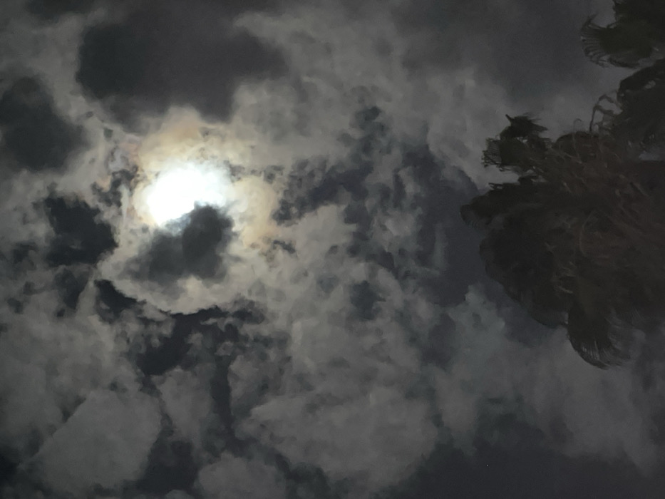 A nocturnal scene in Hims, Syria, displays a luminous, diffused moon positioned in the upper-center of the frame. The moon is partially obscured by dense, textured clouds, which vary in opacity from dark grey to illuminated white and exhibit a subtle iridescent halo with faint yellowish and bluish coloration where moonlight interacts with the cloud edges. The lower-right quadrant of the image features the dark silhouette of a palm tree, its fronds indistinct against the cloudy night sky. No human subjects or distinct artificial structures are visible.
